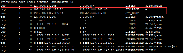 在这里,SSH(22)端口,两条外网IP的SYN_RECV状态连接,直觉告诉了管理员,这里一定有什么异常。