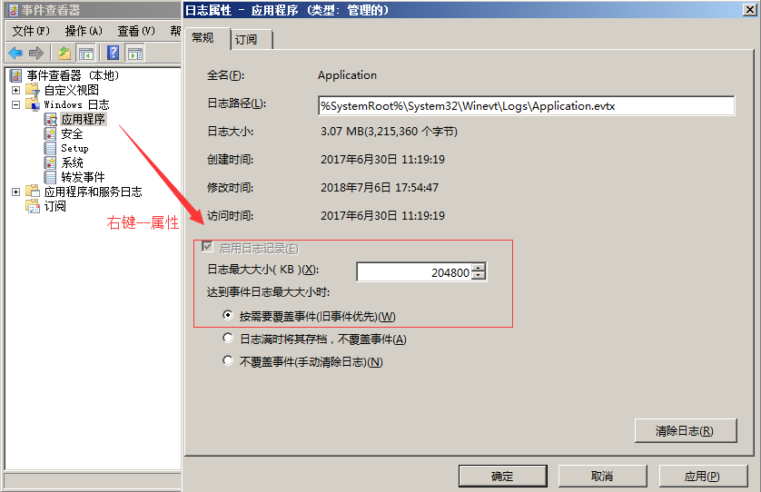 设置2:设置合理的日志属性,即日志最大大小、事件覆盖阀值等: