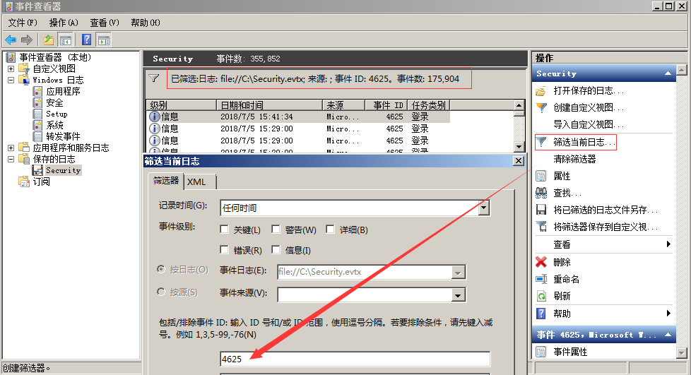 3. 在安全日志右侧操作中,点击“筛选当前日志”,输入事件ID进行筛选。