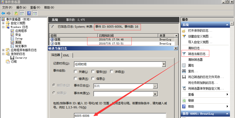 我们输入事件ID:6005-6006进行日志筛选,发现了两条在2018/7/6 17:53:51左右的记录,也就是我刚才对系统进行重启的时间。