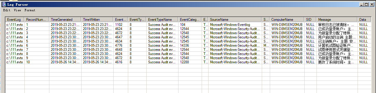LogParser.exe -i:EVT "SELECT EXTRACT_TOKEN(Message,13,' ') as EventType,EXTRACT_TOKEN(Message,19,' ') as user,count(EXTRACT_TOKEN(Message,19,' ')) as Times,EXTRACT_TOKEN(Message,39,' ') as Loginip FROM c:\Security.evtx where EventID=4625 GROUP BY Message"