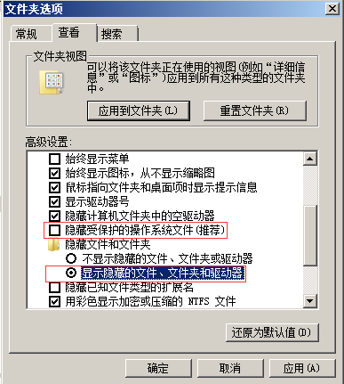1、打开电脑文件夹选项卡,取消”隐藏受保护的操作系统文件“勾选,把”隐藏文件和文件夹“下面的单选选择“显示隐藏的文件、文件夹和驱动器”。
