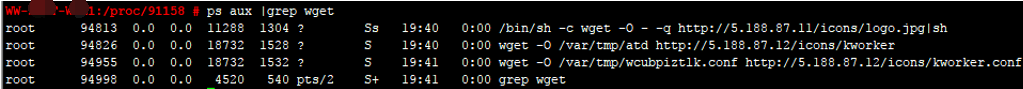 登录服务器,查看系统进程状态,发现不规则命名的异常进程、异常下载进程 :