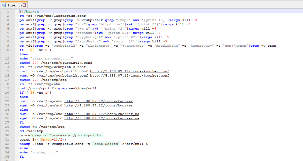 到这里,我们可以发现攻击者下载logo.jpg并执行了里面了shell脚本,那这个脚本是如何启动的呢?