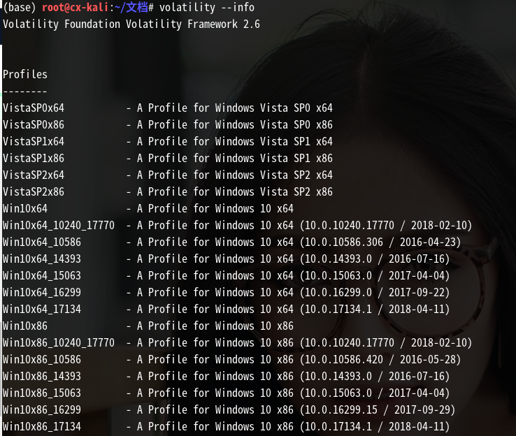 volatility -f <文件名> –profile=<配置文件> <插件> [插件参数]